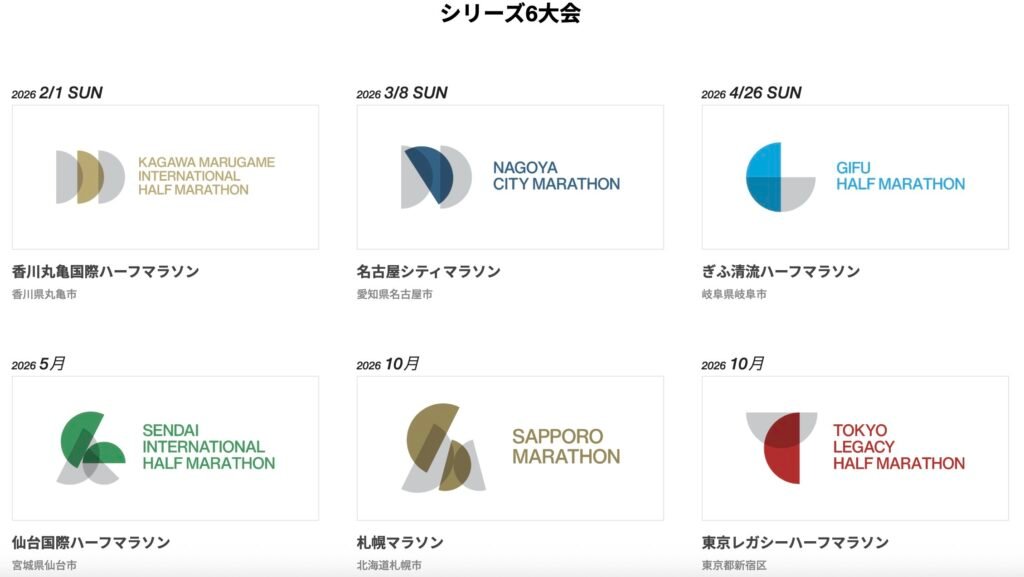 在這個系列中,六場半程馬拉松從日期順序來說的話,首先會以2026年2月的「香川丸龜國際半程馬拉松」打頭陣,接著陸續是「名古屋城市半程馬拉松」,「高橋尚子杯岐阜清流半程馬拉松」,「仙台國際半程馬拉松」,「札幌馬拉松」,和「東京傳承半程馬拉松」。