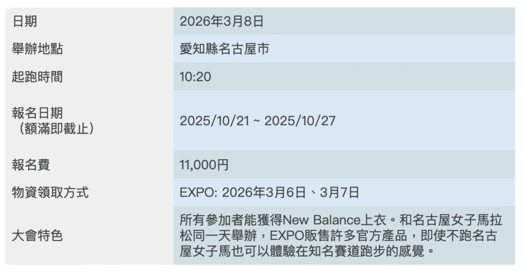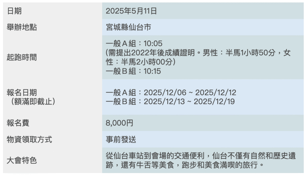 這幾場賽事的確有些本來就有在觀望,因此這個系列推出後有再更認真的規劃參賽。然而挑戰限制兩年內完成,平均一年要跑三場,日本又不像台灣一樣南北一天來回。一場比賽下來,報名費、交通費加上住宿費至少5萬日幣。我另有考慮新幹線從東京當天彈丸的方式,其中可能可以試試的是名古屋和仙台,偏偏名古屋城市半馬沒有提供事前寄送,亦即所有人都必須前一天到現場領去號碼簿,強迫住宿(笑)。目前到底是否要入這個坑,還在猶豫當中。在網路上有看到一些台灣跑者已經報名香川半馬和高橋尚子岐阜半馬,這股對跑步加上日本旅遊的熱忱真的很驚人,看來兩年後很快就會誕生一批半馬大師了。